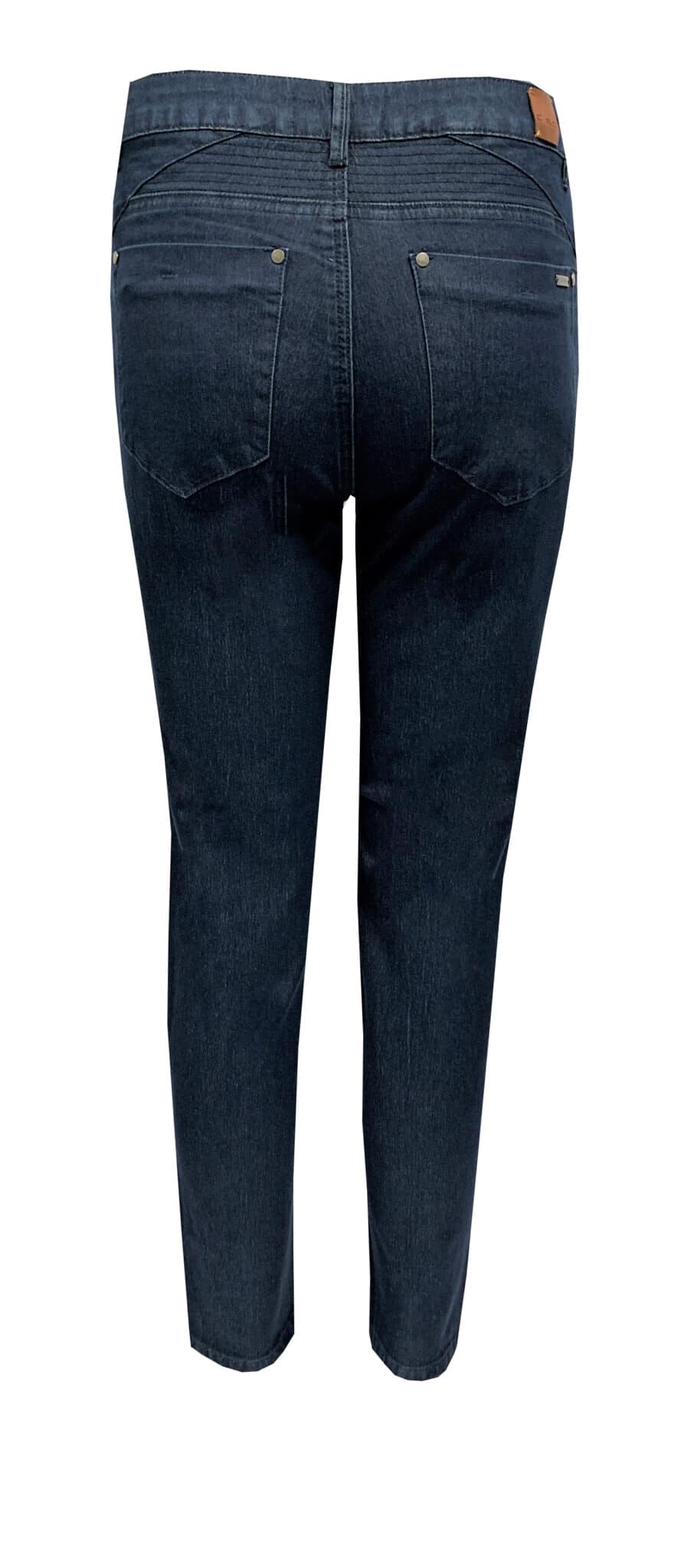 Smart 7/8 dele bukser fra Cro model Suzanne. Modellen er til kvinden med smal talje og med plads til lårene. Buksen har smarte detaljer sidelommer i hver side lomme og på venstre side er der en lynlås lomme. bagpå er der 2 baglommer og farven er i en mørk denim
