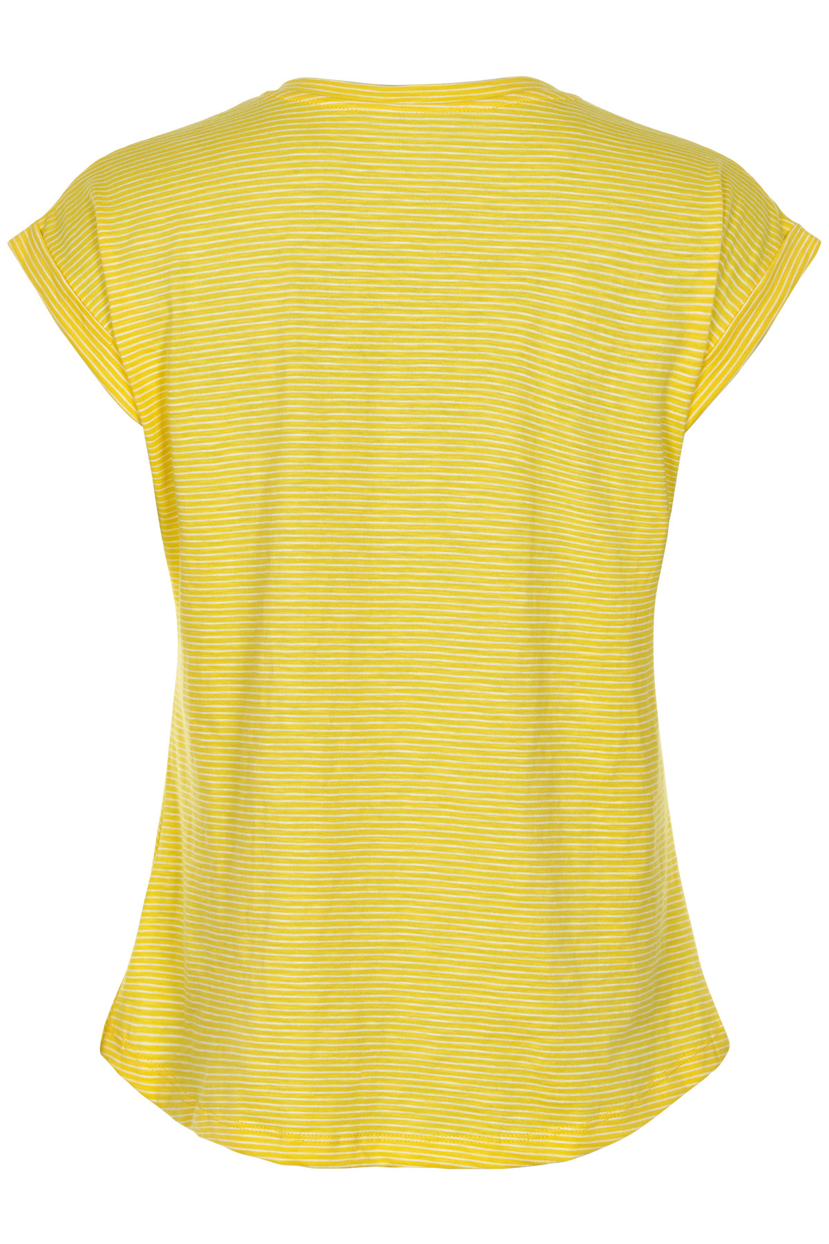 Lækker sommer T – Shirt fra Part Two med rundhals og åbentstående halsudskæring, de korte ærmer er med ombukkede ærmer samt med brystlomme på venstre side. Farve er gul med hvide striber. Styl denne ´T – Shirt til jeans og en lækker snøre sko