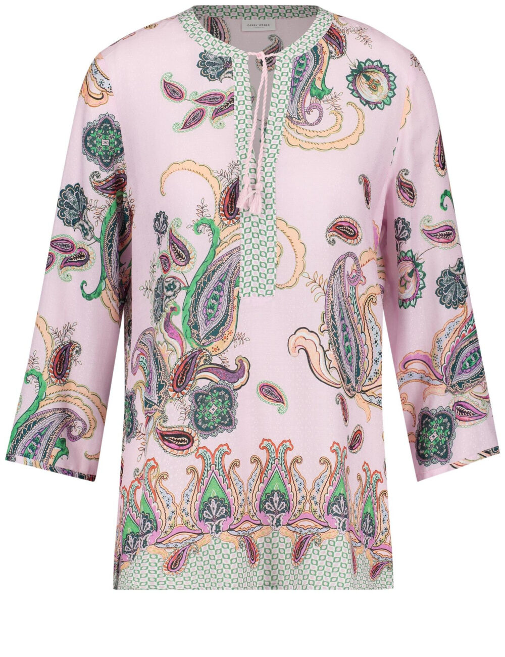 Smuk bluse fra Gerry Weber i lilla med flot mønster. Modellen er med rundhals hvor der foran er en lille snøre effekt. Ærmerne er 3/4 lange og kvaliteten er i let og luftig matriale. Styl denne smukke bluse til jeans eller hvide bukser for et mere sommer look