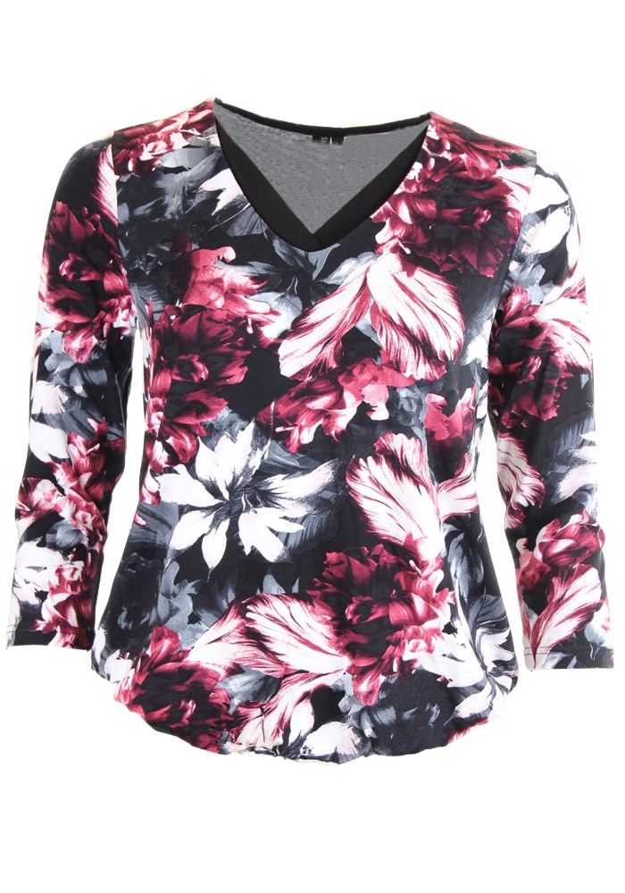 Smart og feminin bluse fra Signature i et sort/pink blomstret print. Blusen er med 3/4 ærmer, elastik i enden og med en v-hals. Blusen er smart sammen med et par fede jeans