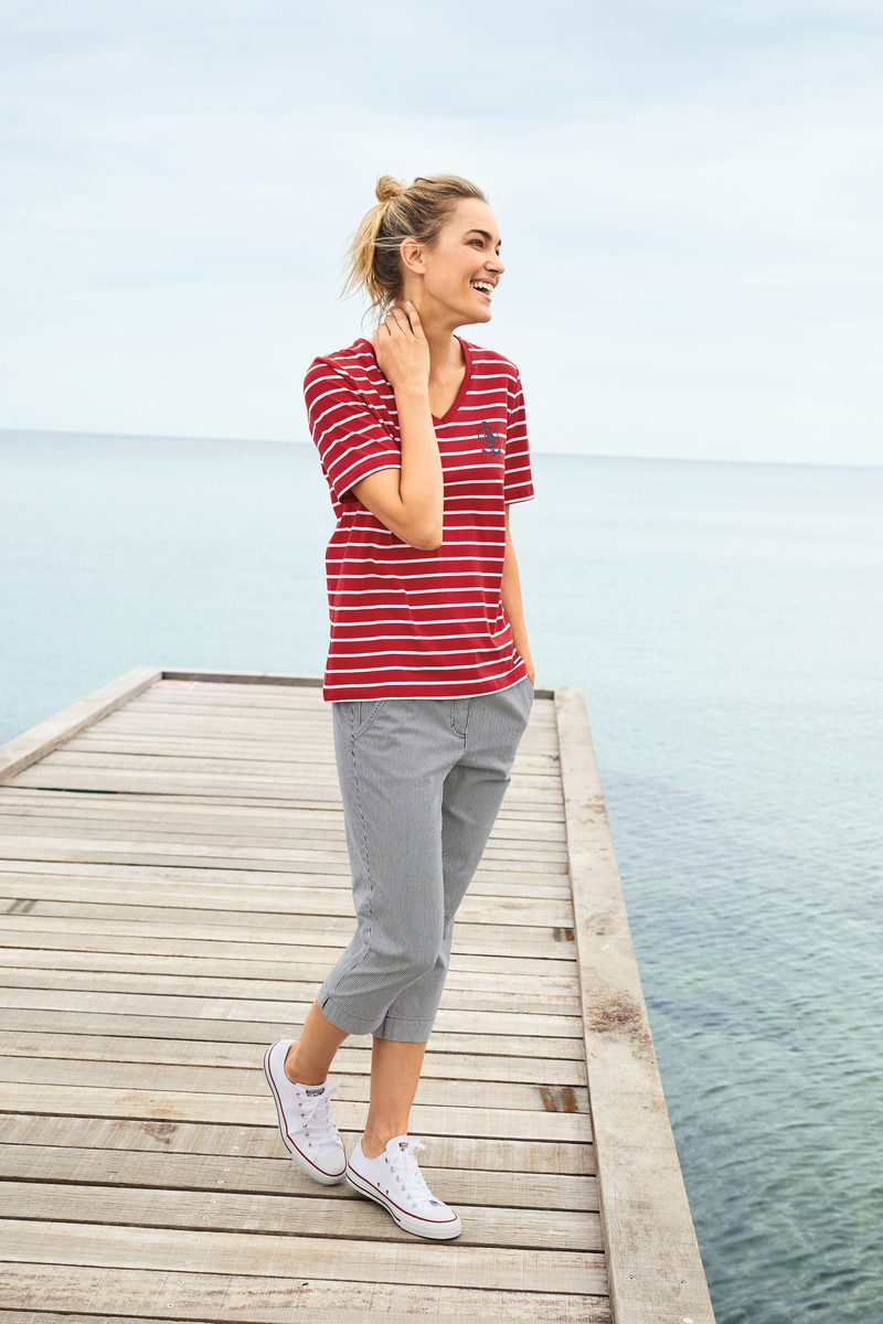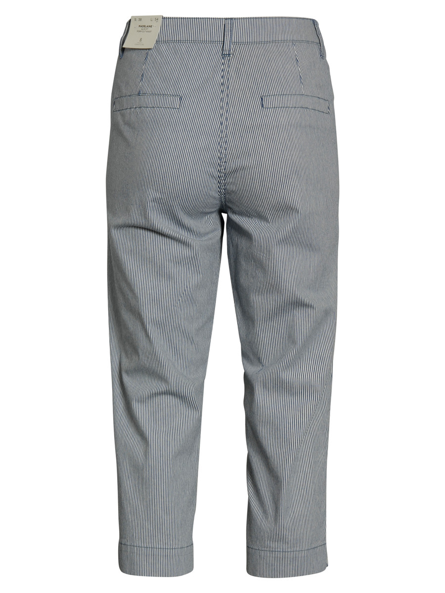 Mælkedrenge stribet stumpebukser fra Brandtex. Modellen er med fast linning samt med lommer i siderne og bagpå er der paspoleret baglommer. Styl denne stumpebukser til T – Shirts og en smart snøre sko. faconen er til kvinden med smal talje men med regular lårviddde.