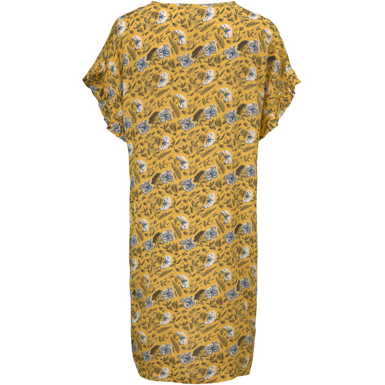 Lækker blomstret kjole fra Masai. Modellen er med rundhals og med korte ærmer hvor der er en flæse kant. faconen er lige op og ned. En rigtig Sommer kjole som kan styles op ned en lille hæl eller bruges med en snøre sko