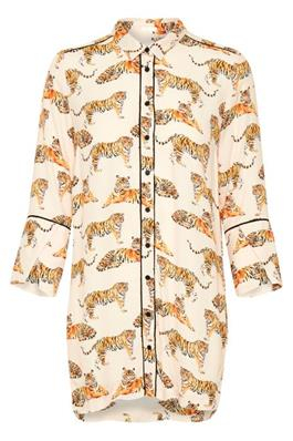 Smart lang skjorte fra InWear. Modellen er med revers krave samt med gennemgående knapper, ærmerne er 3/4 lange og afsluttes flot med asymmetrisk slids. Farven er melon med et skønt tiger print både foran og bagpå. Brug denne skønne lange skjorte over jeans eller sorte bukser med en snøre sko eller for et pænere look en hæl.