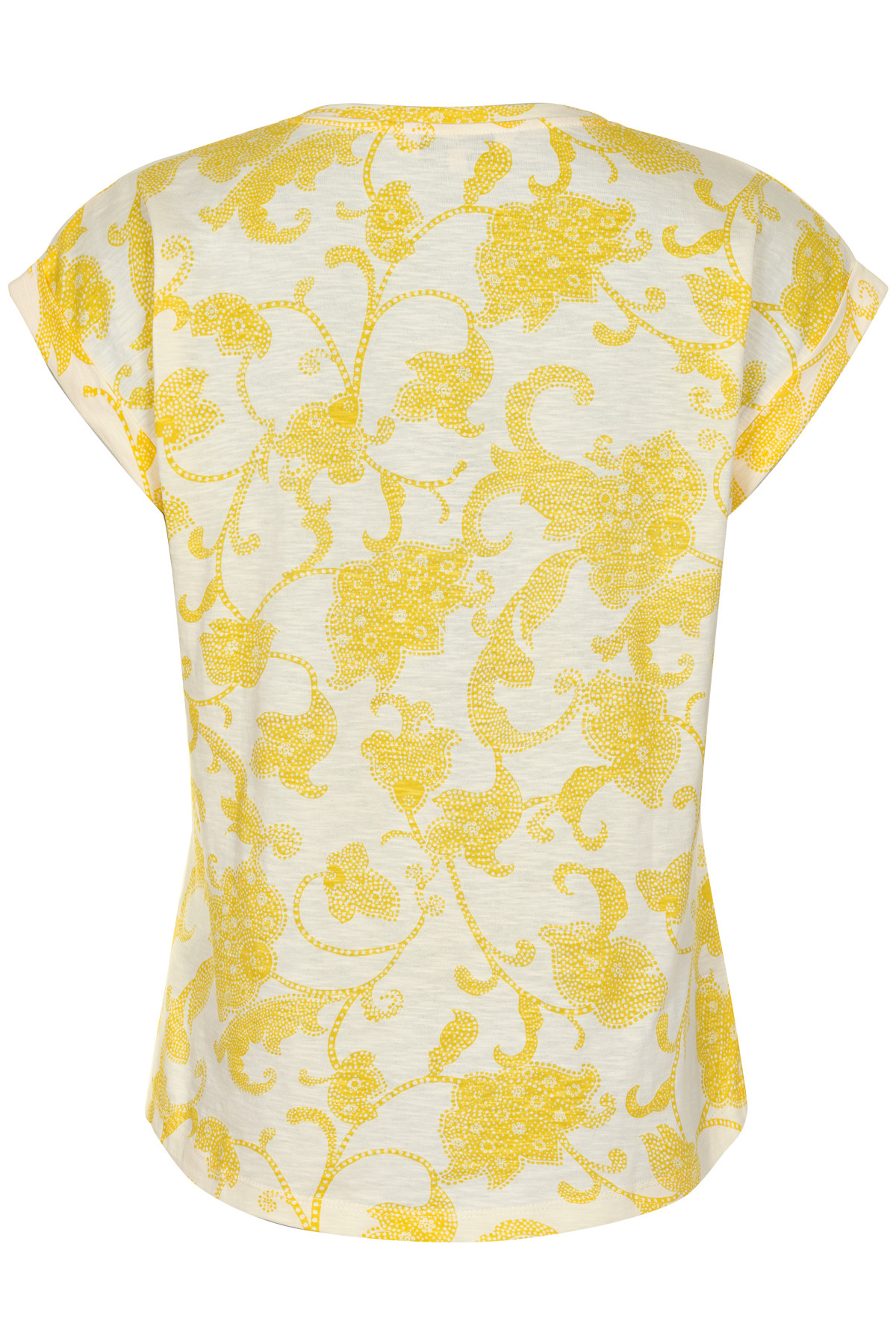 Lækker bomulds T – Shirt fra Part Two. Modellen er med rundhals og med åbentstående halsudskæring samt er de korte ærmer med ombuk. Farven er gul og med garfisk printet gul tryk. Styl denne T – Shirt til jeans eller nederdel med en let snøre sko.
