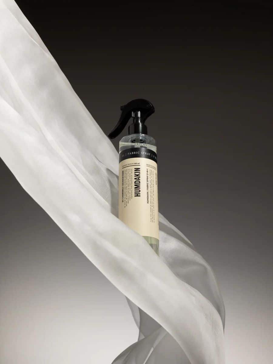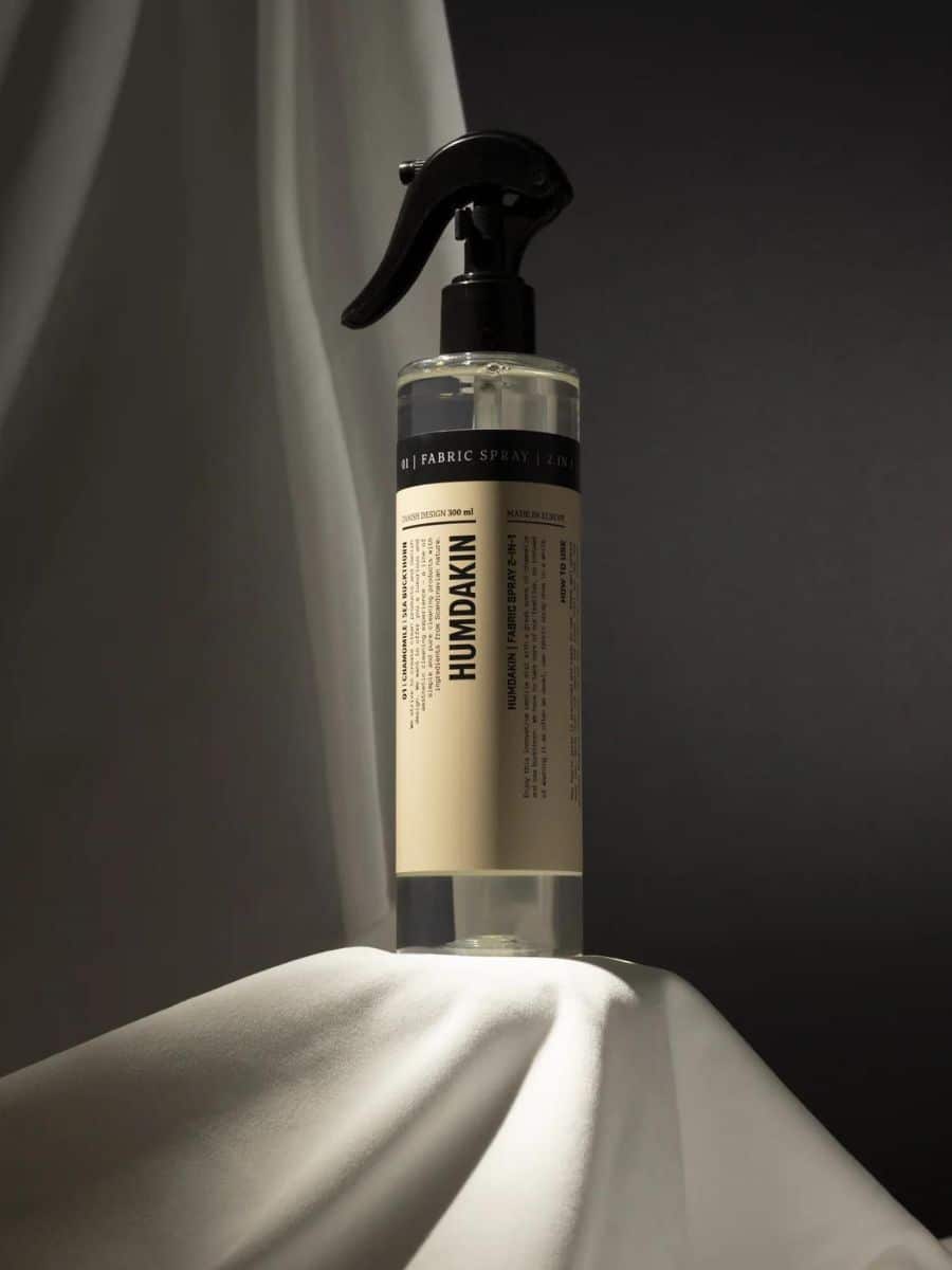 Humdakin Fabric Spray – 300 ml ♥ Nyd denne innovative tekstilspray med en skøn duft af vores signaturduft, 01 med kamille og havtorn, som du også kan finde i Humdakin 01-vaskeprodukter.