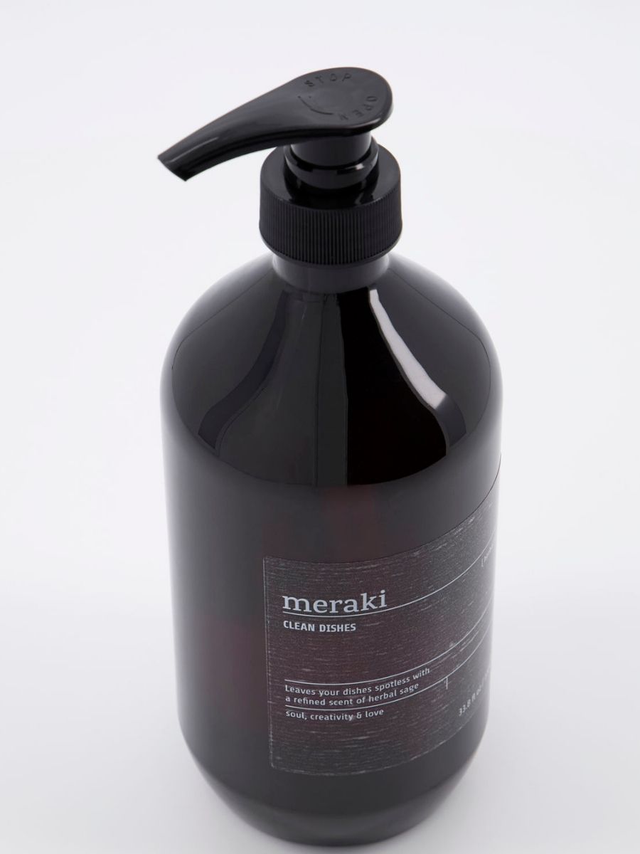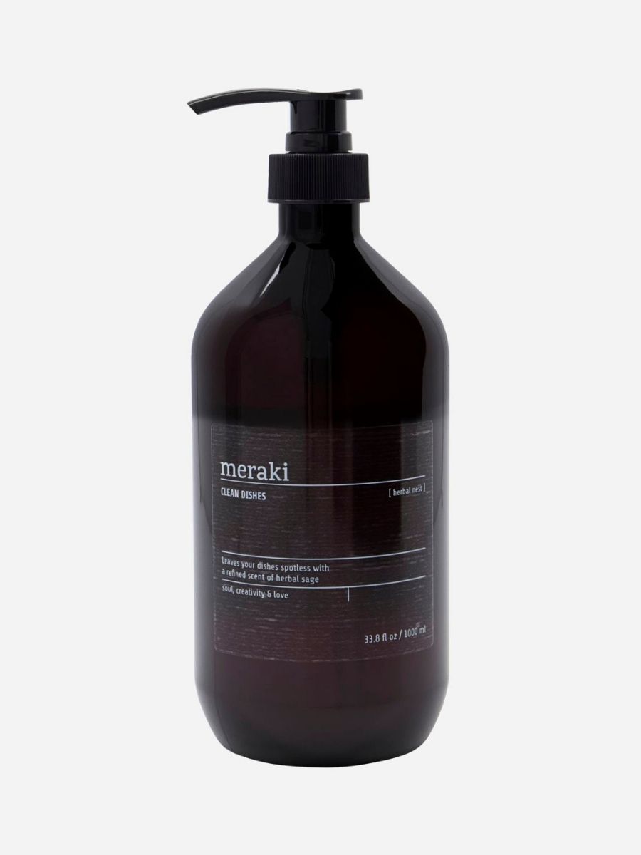 Meraki Dish Wash – Herbal nest ♥ Denne svanemærket opvaskemiddel fra Meraki kommer i en flot indpakning, og kan derfor efterlades ude på køkkenbordet som dekoration. flasken er lavet af plastik og har en pumpe, for at gøre det så nemt som muligt at få produktet ud. opvaskemidlet har en dejlig duft af salvie, citron og musk og efterlader dit køkkenudstyr flot og rent.